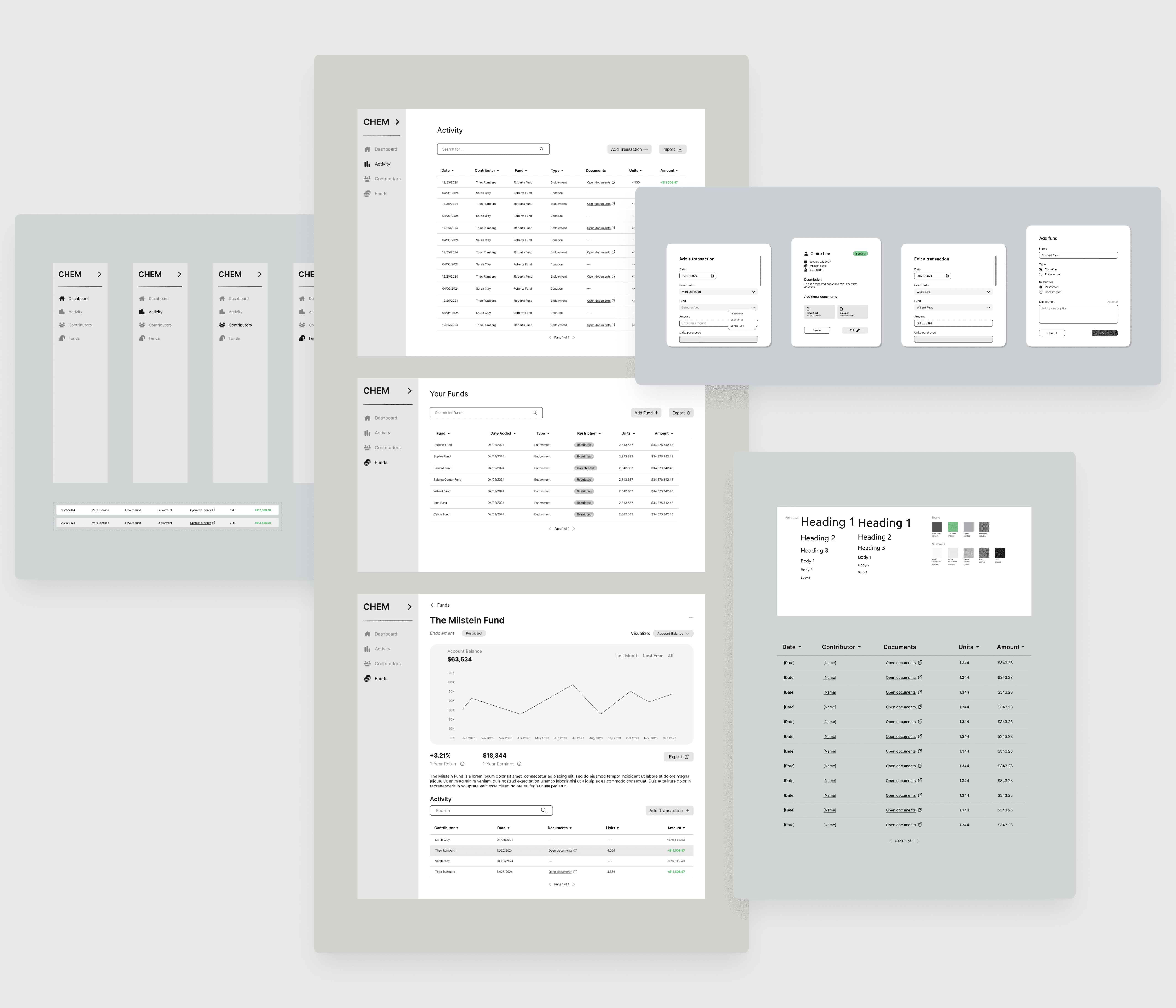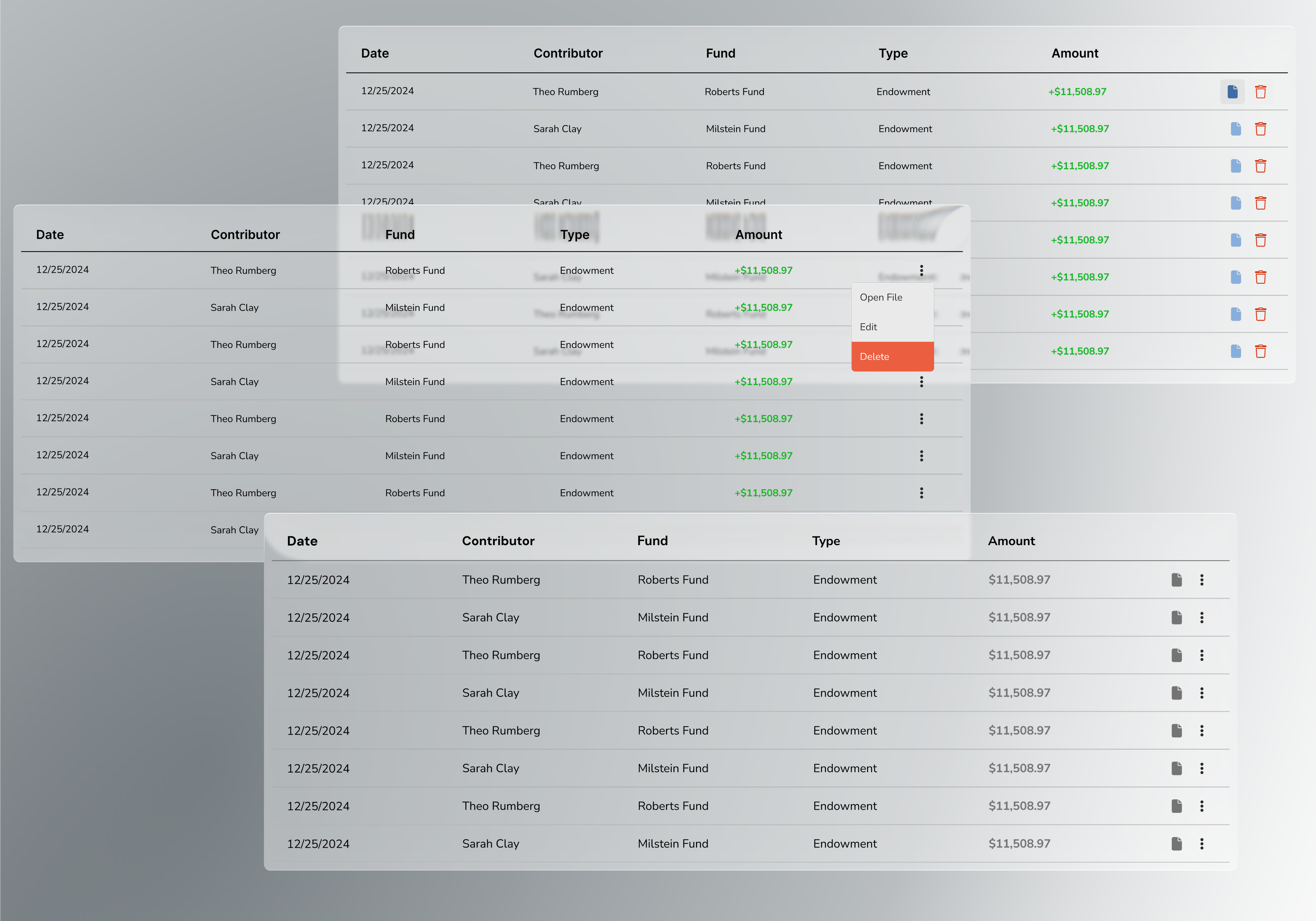 From there, the next iterations focused solely on features for individual transactions. Every transaction has important documentation, so I made that information readily available by placing it alongside other key details. In contrast, editing and deleting donations occur less frequently, so I intentionally made them harder to access by hiding them inside an ellipsis menu.