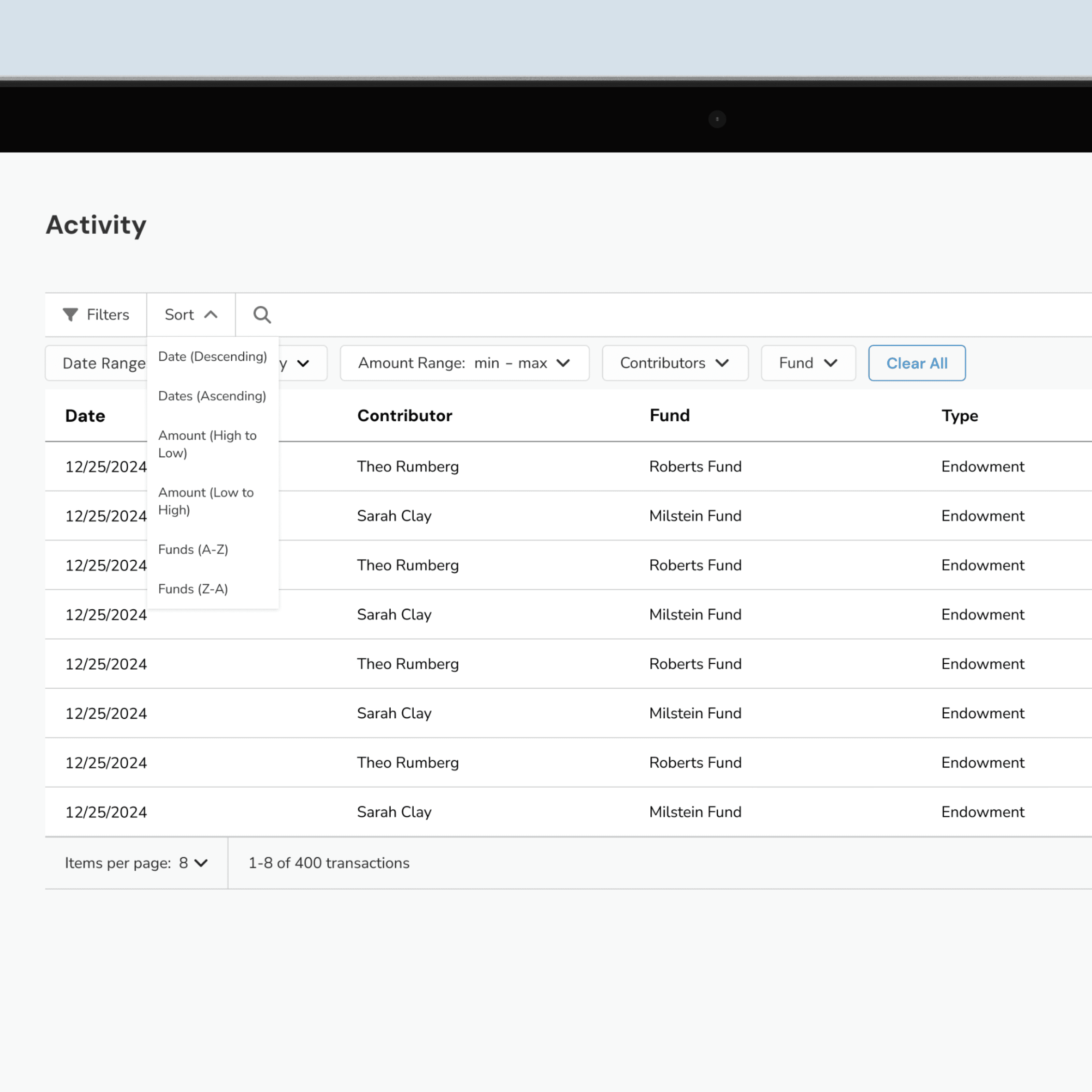 Quickly find what matters. The filtering system lets you zero in on specific donations by date range, amount, contributor name, or fund making it effortless to surface the records you need. Sorting adds another layer of control, letting you reorder by date, donation amount, or fund name to spot patterns or outliers. And when speed matters, the search bar helps you jump directly to the right entry.