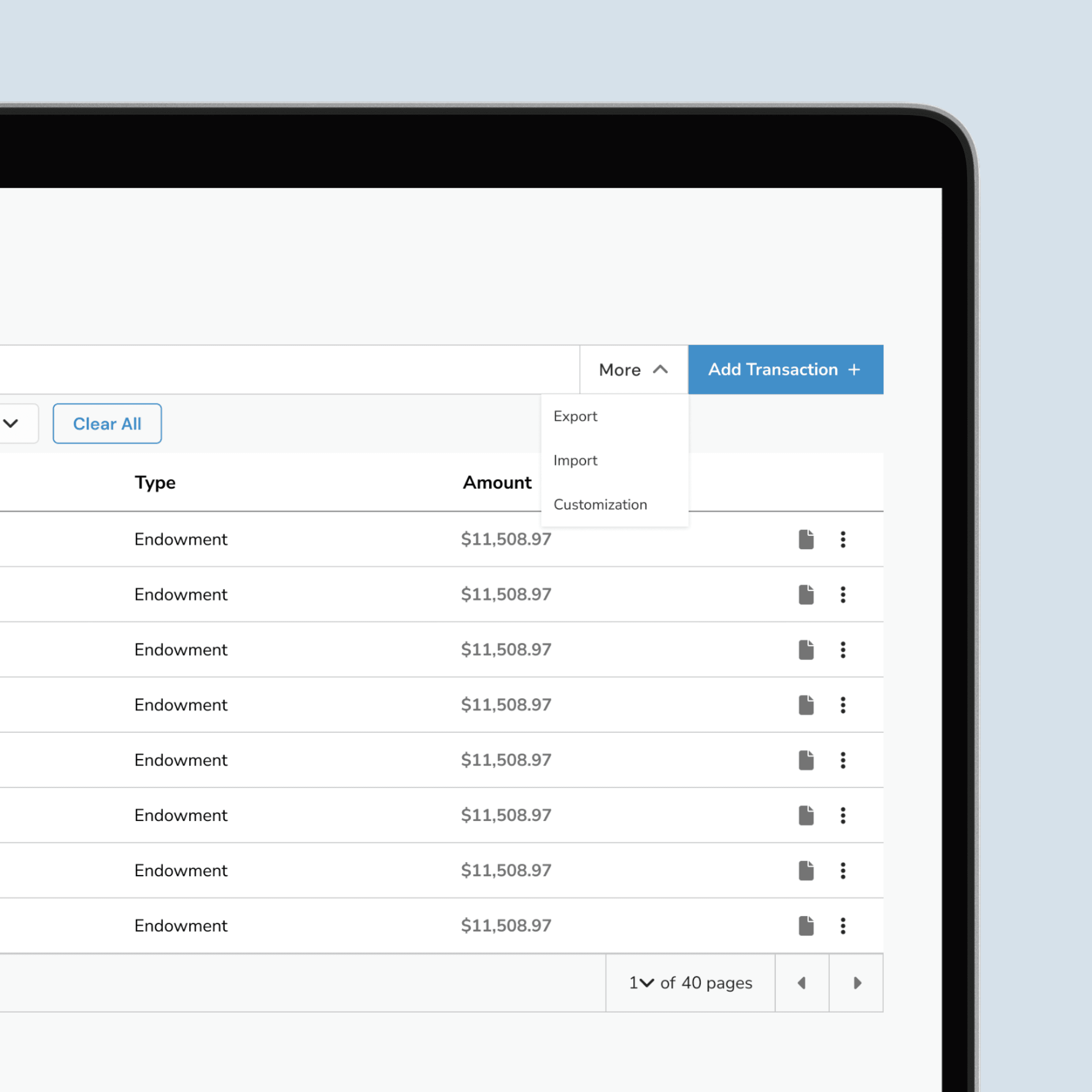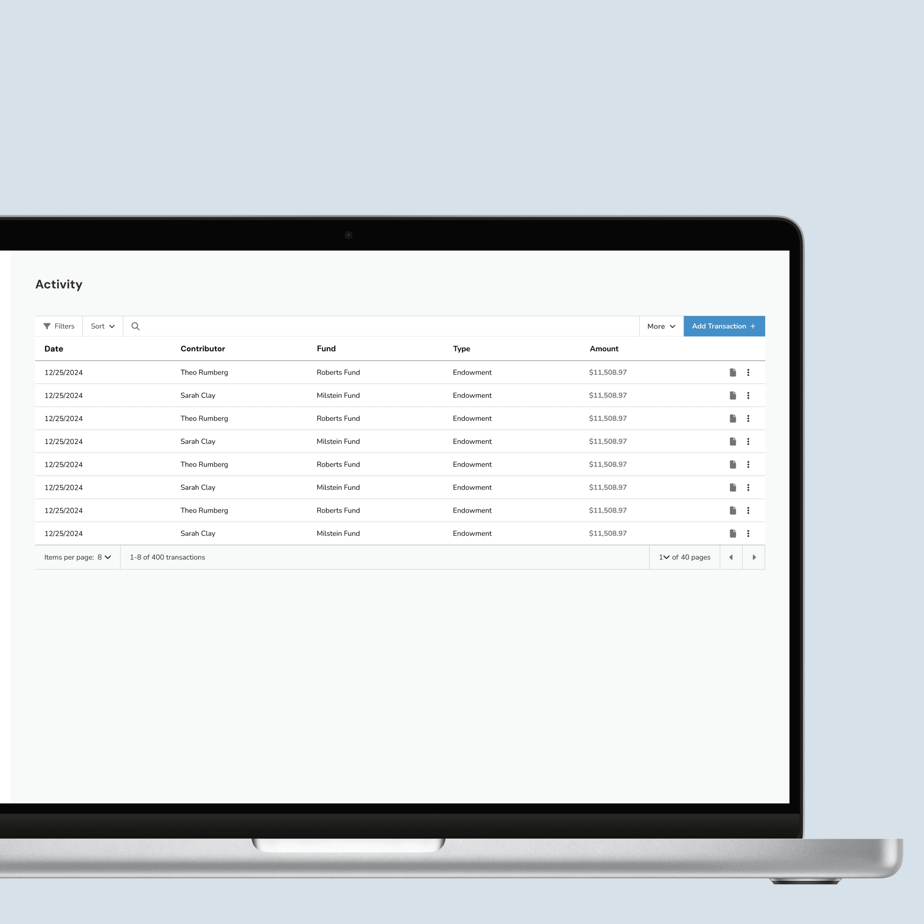 The Activity table offers a clear, customizable view of all incoming contributions. You can adjust how many rows appear on screen, quickly scan donation amounts, timestamps, linked documentation, and page through large sets of records with ease. Built-in controls let you edit or delete entries via the ellipsis menu, making it easy to keep data clean and up to date without leaving the table.