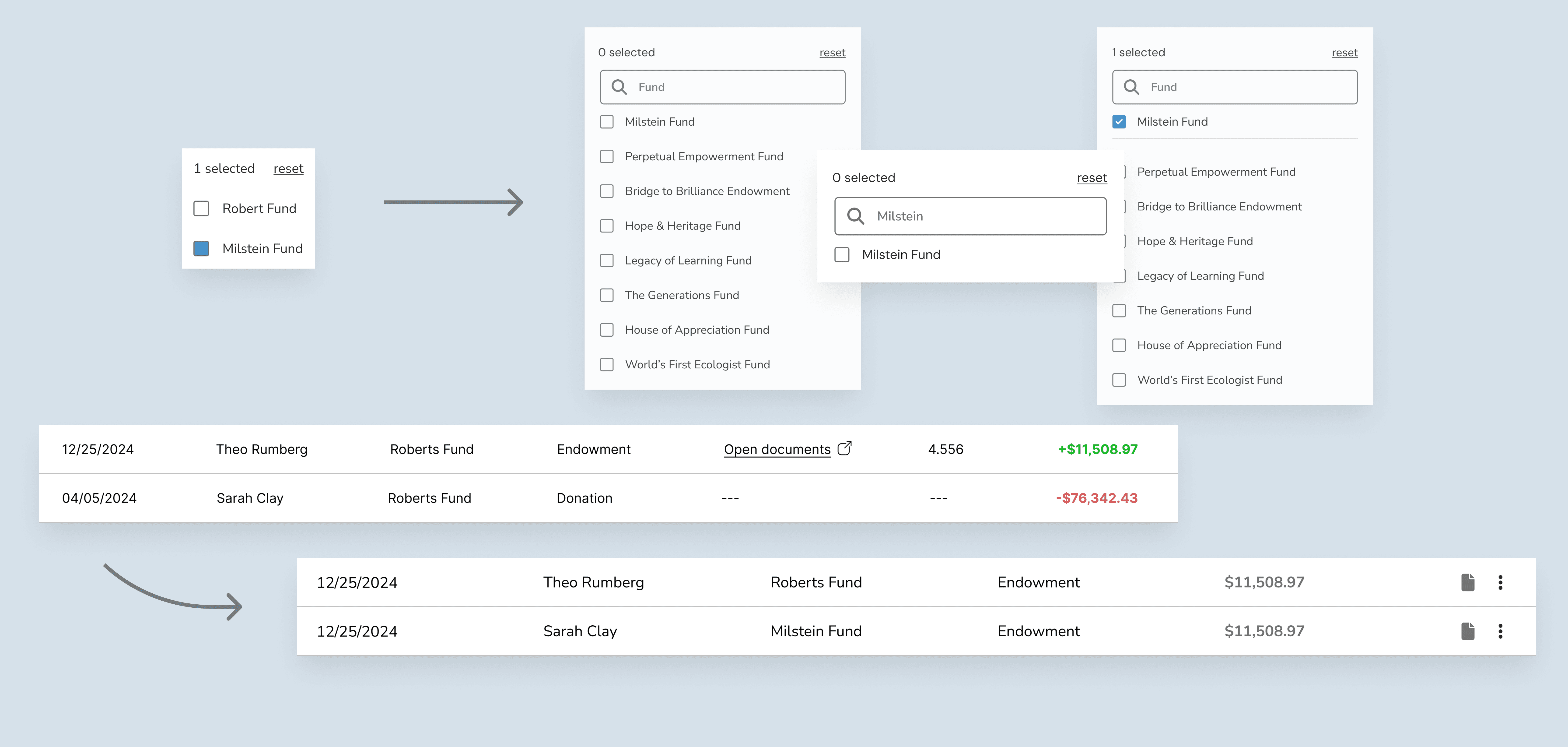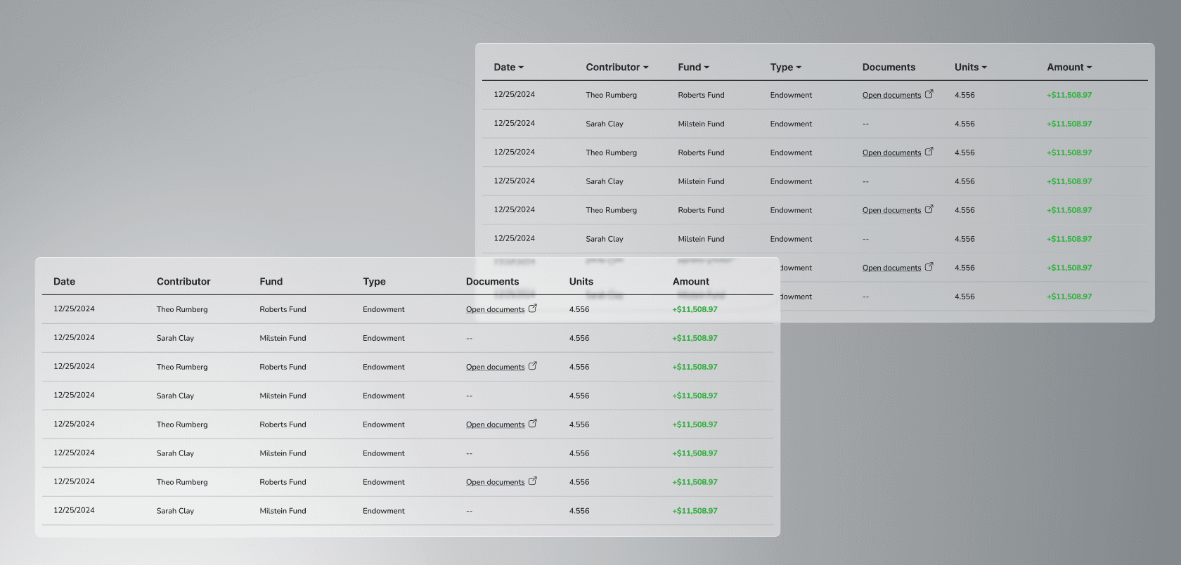 Contributors and Funds each tell their own story. The Contributor filter reveals a donor’s history, helping track their engagement over time. The Funds filter shows how a specific fund has grown, letting users connect individual donations to a bigger picture.