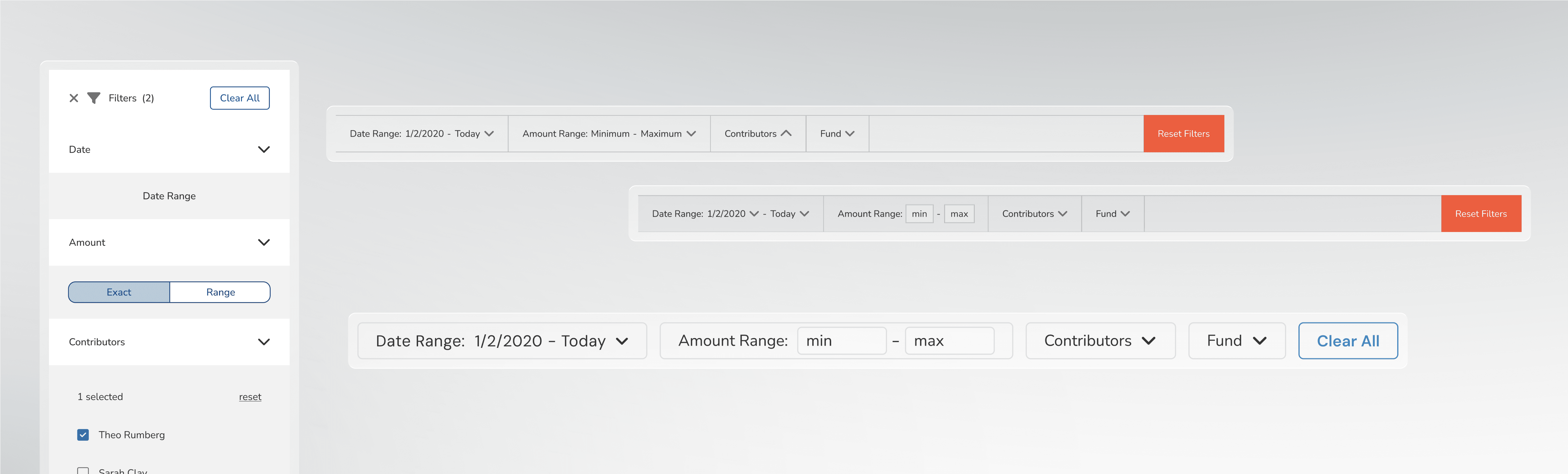 Next, I shifted my focus to how the filter options would be displayed. My research made it clear that four stood out as essential for anyone examining their activity: Date Range, Amount Range, Contributors, and Funds.